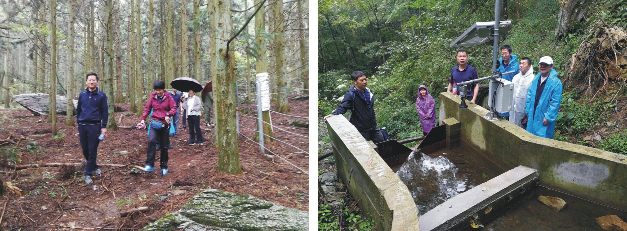(图左:在月照松林探究地质构造特征,图右:在大天池考察裂隙泉)