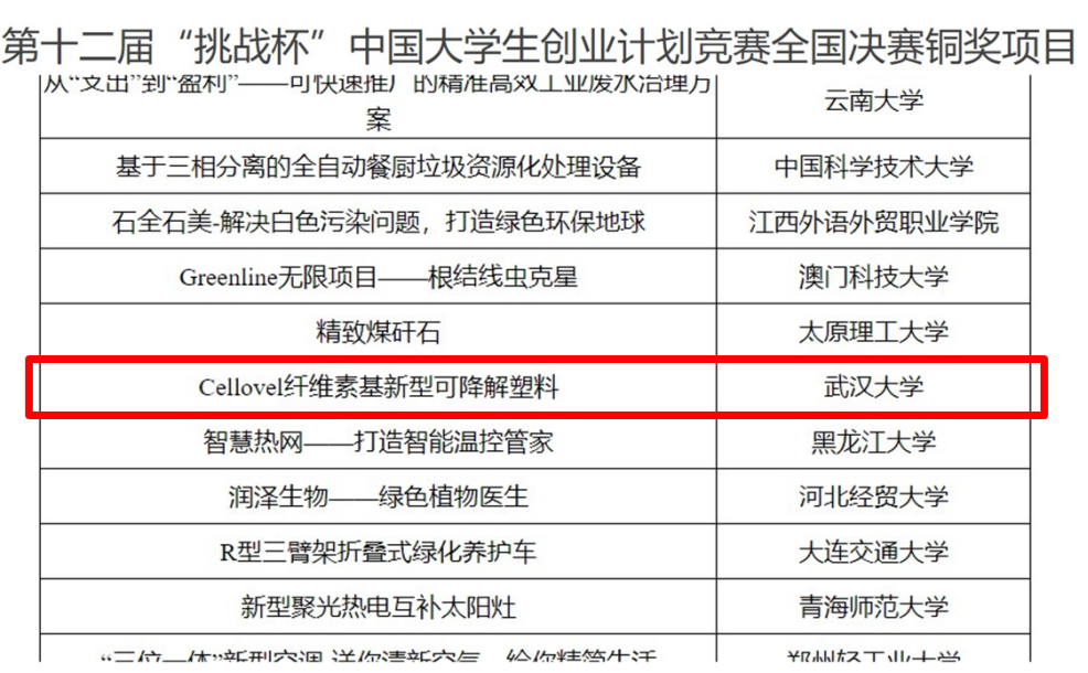 在日前结束的第十二届“挑战杯”中国大学生创业计划竞赛中,由91沈先生 邓红兵教授指导、2017级本科生赵笑宇担任队长、2018级本科生熊凡、康馨、2017级本科生马燕燕、胡瀚文为队员参加的项目《Cellovel纤维素基新型可降解塑料》获铜奖。