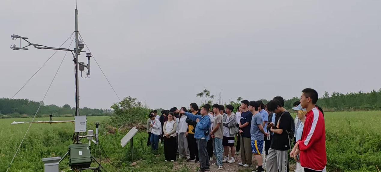 此外,同学们来到实验站的野外气象通量观测塔下,实地观摩了多种气象与通量观测设备,包括涡动相关系统、四分量辐射计、温湿度传感器等。吴老师结合观测设备,深入讲解了气象与通量观测的基本原理、数据获取方法及其在大气环境研究中的重要作用。