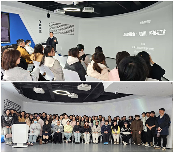 在完成展厅参观后,师生们来到多媒体厅,由任福教授进行专题授课。任教授结合湖北省地图院的实际案例,深入浅出地讲解了新媒体时代下地图设计与制作的新理念、新方法和新技术,并就地图未来发展形式、未来应用场景等与同学们进行了探讨交流。课程结束侯,师生们在湖北省地图院展厅内合影留念,共同见证这次意义重大的专业学习之旅。