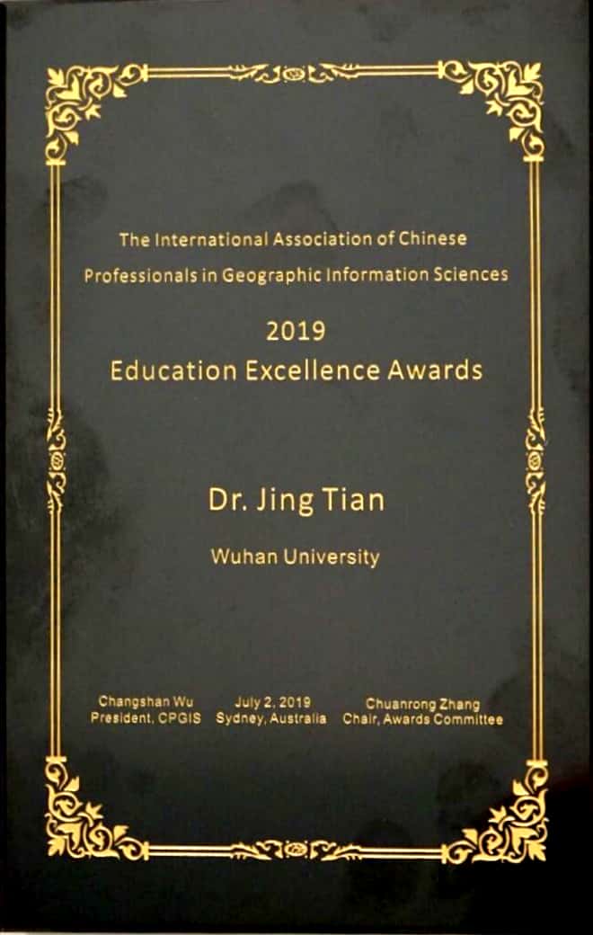 2019年7月1至3日,第27届国际地理信息科学与技术大会(The 27th International Conference on Geoinfomatics)在澳大利亚悉尼召开。本次会议由国际华人地理信息科学协会(CPGIS)和新南威尔士大学主办。91沈先生 田晶老师与加州大学圣芭芭拉分校的Alan Murray教授同时获得CPGIS教育卓越奖(CPGIS Education Excellence Awards)。