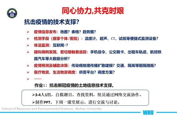 在开课第一堂课《导言》中,增加一个单元:抗击COVID-19疫情的信息技术支撑,引导同学们利用专业知识为抗击疫情服务。要求学生3-4人一组,根据自己所学的专业知识结合当前抗击疫情的需要进行思考,自拟题目,查找资料,组员通过网络交流协作,并制作PPT在下周进行课堂展示。选题包括:疫情信息发布、检测手段、疑似病例发现、密切接触者追踪、疫情预测及辅助决策、医疗物资、生活物资调度等方面。