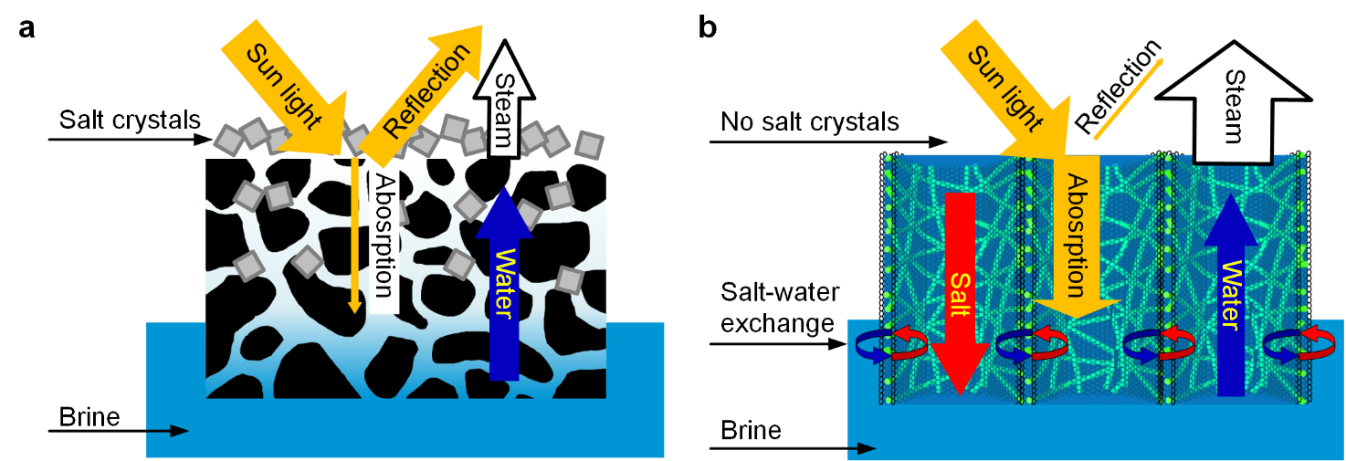 图1 a)常规太阳能蒸发器中的水运输,光吸收,蒸发和盐结晶的示意图。b)纳米纤维(CNFAs)气凝胶中的盐运输,水运输,光吸收和蒸发的示意图。