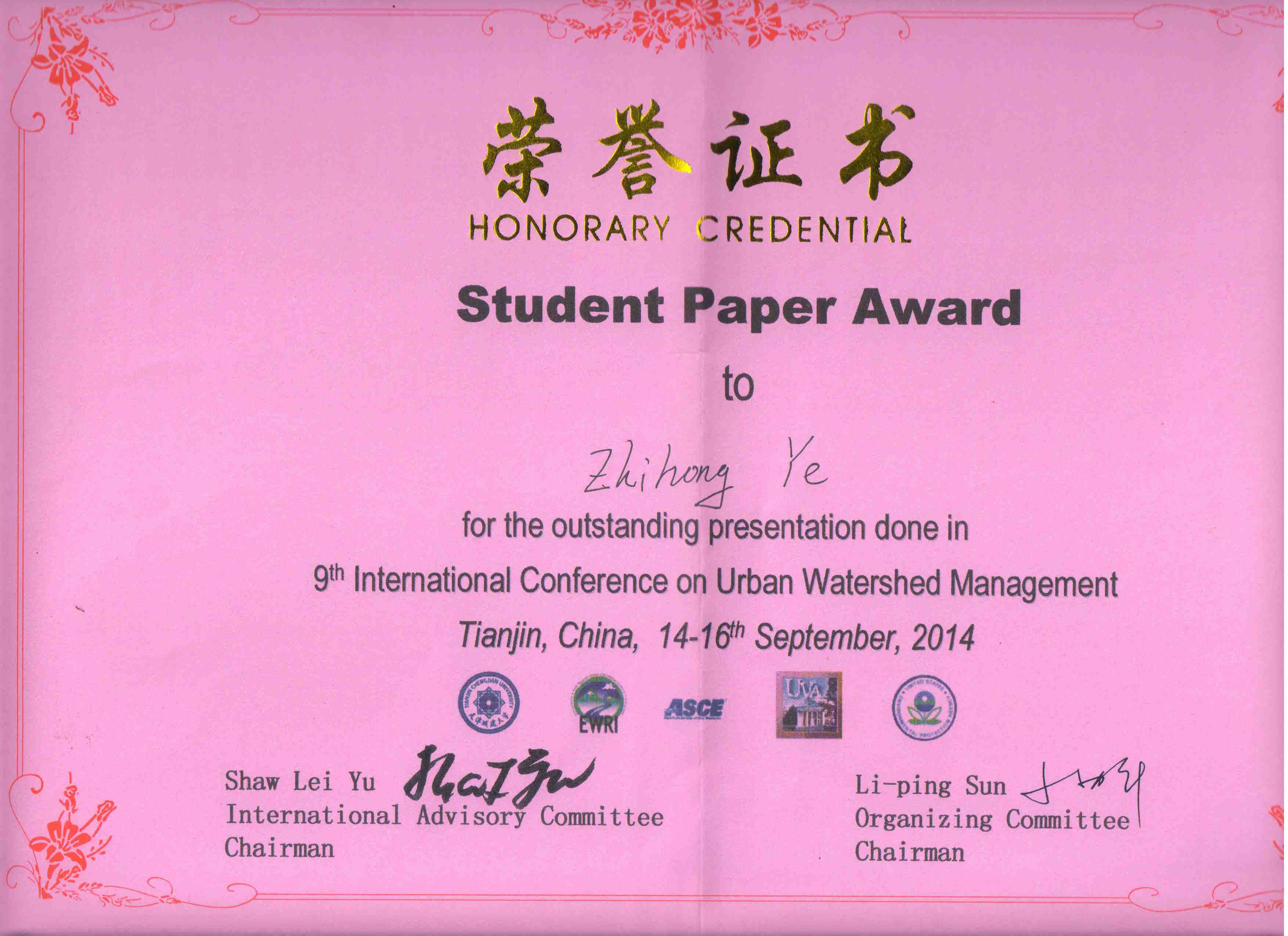 2014年9月14~16日,环境工程系张晖实验室一行3人参加了在天津举行的“the 9th International Conference on Urban Watershed Management: Sustainable Water Technologies and Impact Assessment of Climate Change (9th ICUWM)”国际会议,并分别由吴小刚博士和硕士生叶志洪宣读了2篇有关渗滤液处理的学术论文,其中叶志洪的论文“Electrochemically assisted UV/chlorine process for the treatment of landfill leachate”获大会“Student Excellent Paper Award”。