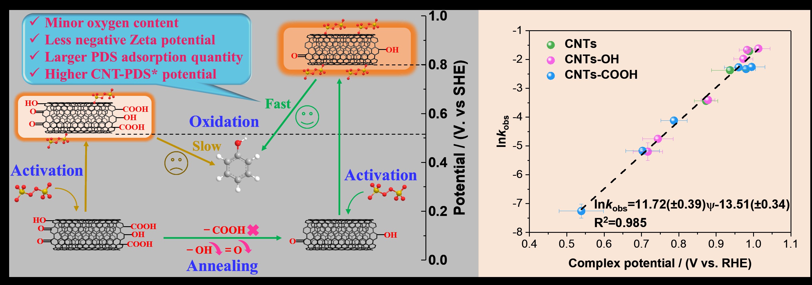 题为“Insights into the Electron-Transfer Regime of Peroxydisulfate Activation on Carbon Nanotubes: The Role of Oxygen Functional Groups”的论文旨在揭示碳活化过硫酸盐体系中碳材料结构与有机物电子转移速率的内在关系。通过高温退火制备了一系列表面氧含量不同的碳纳米管。猝灭实验和开路电位结果表明,经过高温退火后,PDS/CNT体系能强化电子转移过程,进而提高苯酚的氧化速率。通过构建QSARs以及Tafel方程拟合,揭示了PDS/CNT体系中电子转移过程氧化有机污染物的反应机制。首先,降低CNT表面含氧量能使其表面在中性溶液中的Zeta电位更正,从而促进PDS在CNT表面吸附,并形成更多的CNT-PDS*复合体。随后,复合体的形成提升了CNT的氧化还原电位使其具有一定的氧化能力。最后,苯酚在CNT表面通过电子转移过程被CNT-PDS*氧化。其中,非自由基氧化速率与复合体电位呈指数关系,这是因为CNT-PDS*的非自由基氧化机理与阳极氧化的类似(图2)。