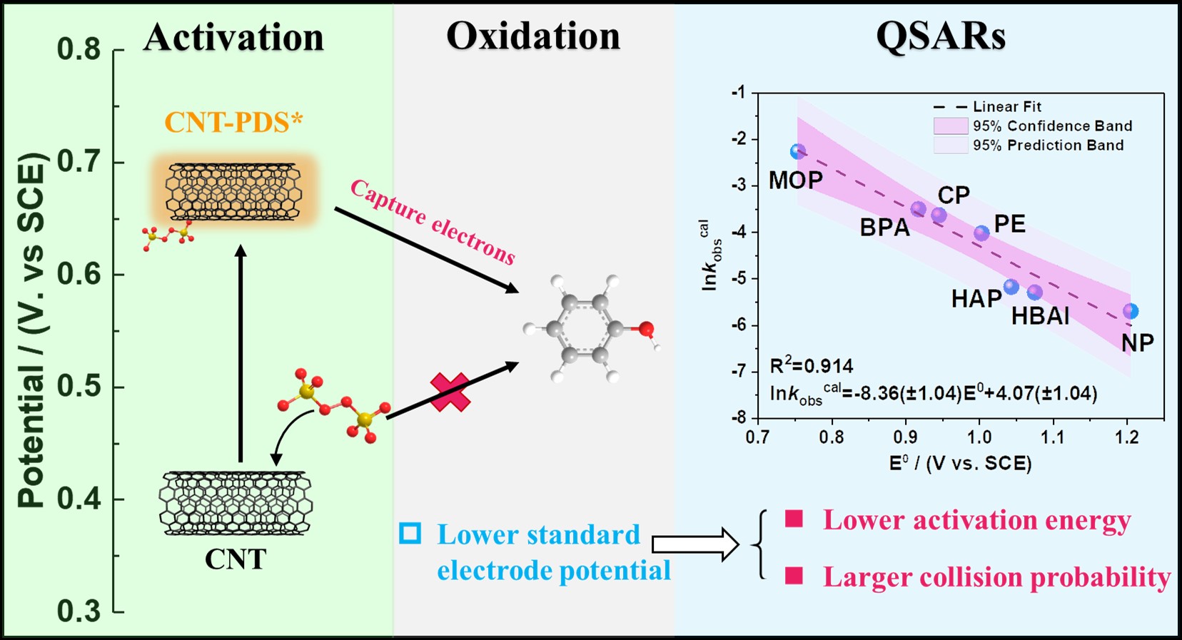 题为“Activation of Peroxydisulfate on Carbon Nanotubes: Electron-Transfer Mechanism”的论文提出了一种组合电化学分析方法用于研究碳活化过硫酸盐体系的电子转移过程。通过半波电位评价了12种酚类化合物的电化学性能,并将其与碳纳米管活化过二硫酸盐(PDS/CNT)体系中的动力学速率常数构建相关性。通过定量构效关系(QSARs)分析、电子顺磁共振(EPR)技术和自由基清除实验,揭示了碳活化过硫酸盐体系非自由基电子转移过程氧化酚类化合物的内在机制。采用简易的电化学分析方法(开路电位法和计时电流法相结合技术)对PDS/CNT体系进行了机理研究,实验结果发现PDS在CNT表面活化能形成具有氧化能力的CNT-PDS*复合体。所形成的复合体通过夺取电子的方式选择性地氧化CNT表面共吸附的酚类化合物。通过PDS/CNT体系与石墨阳极氧化体系的对比可以发现PDS/CNT体系对酚类化合物的选择性主要依赖于CNT-PDS*复合体氧化能力和酚类化合物的氧化电位(图1)。