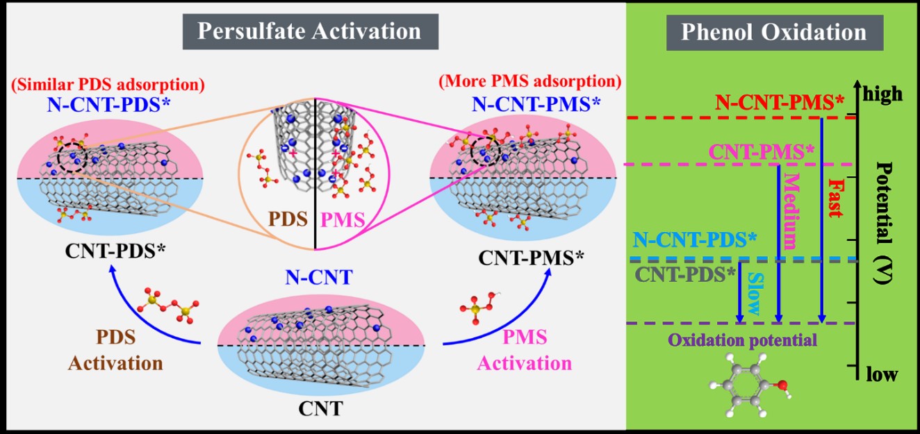 题为“The Intrinsic Nature of Persulfate Activation and N-Doping in Carbocatalysis”的论文致力于说明CNT表面的氮元素对PMS和PDS活化有着本质上的区别。在PMS/N-CNT体系中,表面氮掺杂可以显著地提高N-CNT对PMS的吸附量以及N-CNT的复合体电位,从而加速PMS/N-CNT体系的电子转移过程,促进有机物的氧化。相比之下,在PDS/N-CNT体系中,氮掺杂不会影响CNT对PDS的吸附量:即与PDS/CNT体系相比,PDS/N-CNT对有机物的氧化速率均没有明显变化。当N-CNT对PDS和PMS的吸附量相等时,PDS/N-CNT表现出比PMS/N-CNT更强的氧化能力,这是因为PDS的标准还原电位高于PMS。此外,PDS/N-CNT和PMS/N-CNT体系的氧化速率与其复合体电位均具有很好的线性关系,说明N-CNT活化PMS和PDS对有机物的氧化具有相似的电子转移机制(图3)。