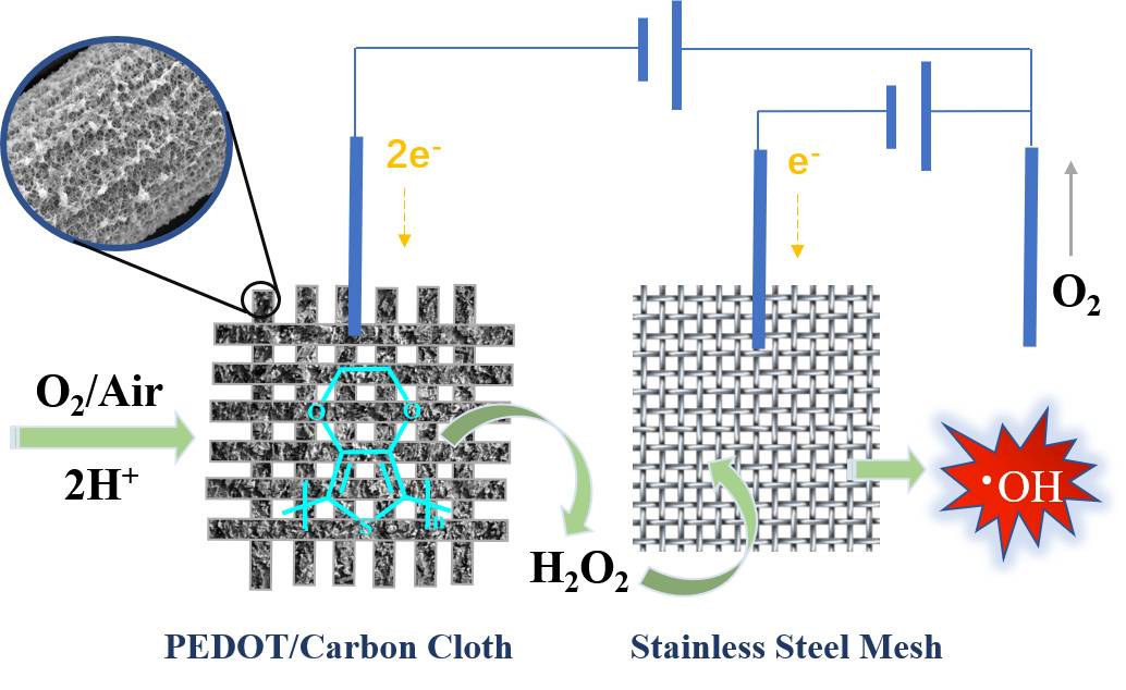 基于前期研究,采用电化学沉积在碳布负载聚(3,4-乙烯二氧噻吩)(PEDOT)作为阴极,可实现电子转移数约为2.5,电流效率为88.7%的高效生成过氧化氢;在两小时获得浓度为243.1 mg/L的过氧化氢水溶液,能耗仅为4.7 kWh/kg H2O2。生成的过氧化氢可在第二阴极——不锈钢网上进一步电还原产生羟基自由基,通过电子顺磁共振与荧光光谱法验证了自由基的来源。降解实验证明该方法产生的羟基自由基可同步实现有机染料的脱色与TOC去除。