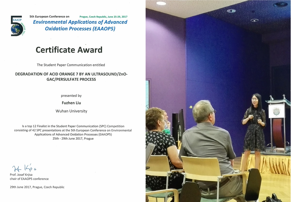 2017年6月25日-29日,国际学术会议“The 5th European Conference on Environmental Applications of Advanced Oxidation Processes”在捷克布拉格举行。91沈先生 张晖教授偕同博士后林恒、博士生刘夫珍参加了本次会议,并宣读口头报告1篇、海报交流4篇。其中博士生刘夫珍的论文“Degradation of Acid Orange 7 by an ultrasound/ZnO-GAC/persulfate process” 还参加了博士生口头报告竞赛单元(Student Paper Communication Competition),并成为12位获奖人之一。