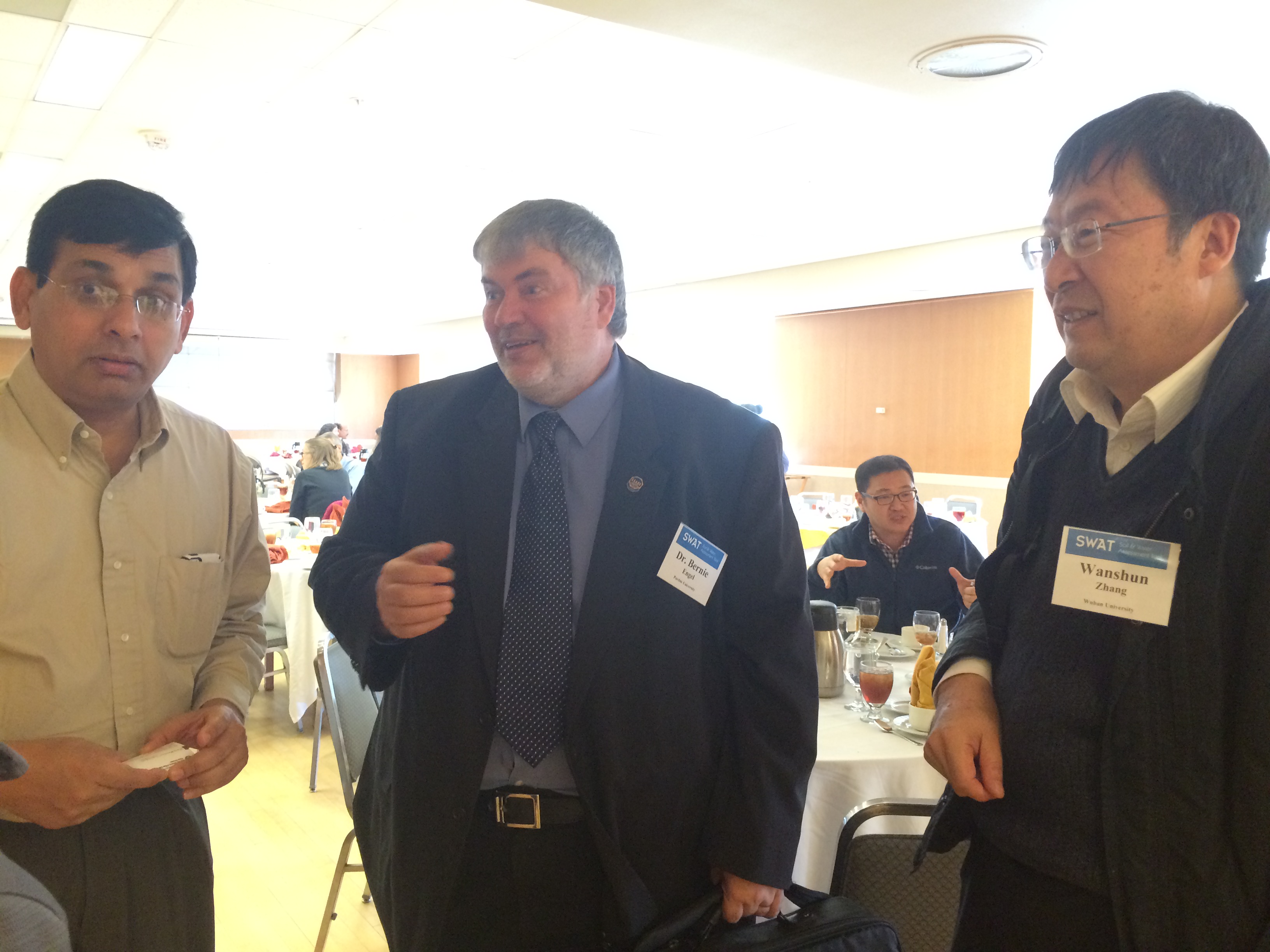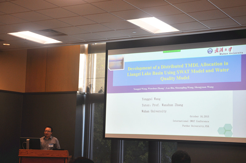 2015年10月14日-16日,2015年国际SWAT会议(The 2015 International SWAT conference)在美国普渡大学举行。本届SWAT会议吸引来自10个国家的140名学者参与。应美国普渡大学农业与生物工程系(Agricultural & Biological Engineering, Purdue University)系主任Dr. Bernard Engel邀请,91沈先生 张万顺教授携课题组师生5人参加了此次大会,并以口头报告的形式系统展示了课题组在三峡、梁子湖等流域应用SWAT模型的创新成果,受到与会学者的关注和好评。会上,张万顺教授与SWAT创始人Jeffrey G. Arnold等学者就SWAT模型在中国的应用和发展进行了交流,Jeffrey G. Arnold等学者期待在2016年的SWAT国际会议上能与课题组再次交流,课题组能进一步分享SWAT研究的创新成果。