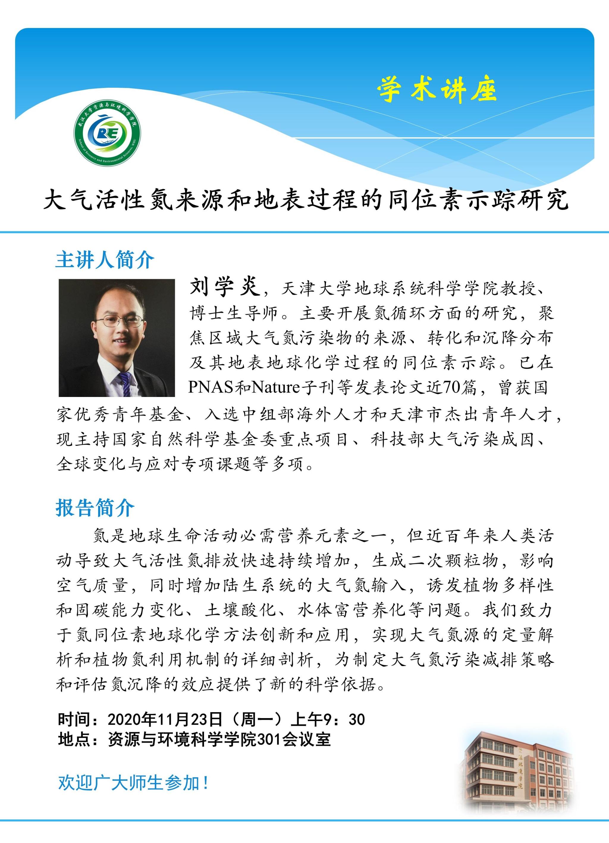 11月23日讲座信息:大气活性氮来源和地表过程的同位素示踪研究