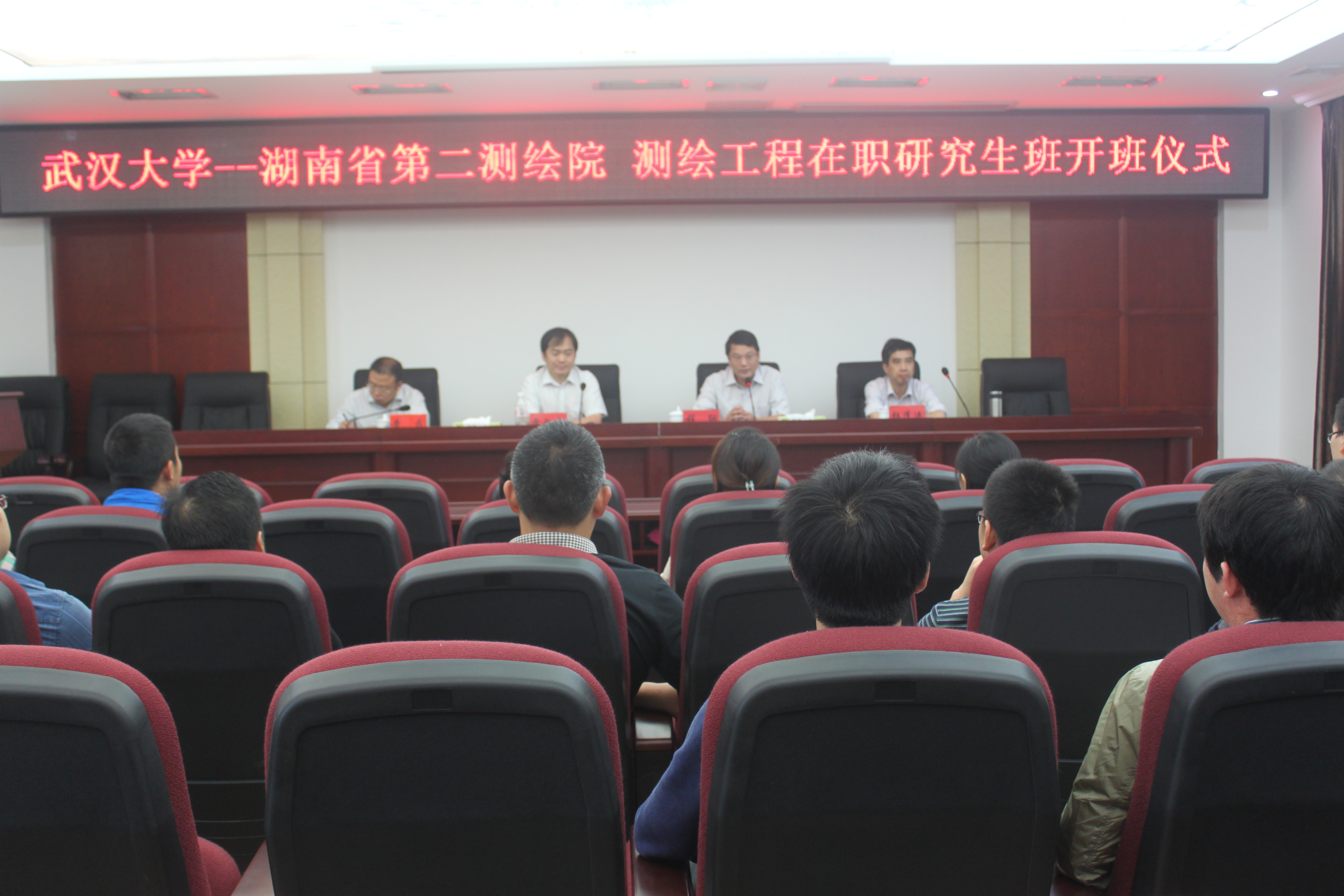 开班式上,湖南省第二测绘院程纲院长首先致词,他希望各位学员能要珍惜学习机会,不断提高专业技能以应对新的工作要求,能促进第二测绘院的技术升级,切实解决工作中遇到的工作问题。他以黄埔军校门前的对联“升官发财请往他处,贪生畏死勿入斯门。横批:革命者来”和当代知名武侠小说作家金庸以80多岁高龄求学英国剑桥大学的事例,勉励全体学员要抱着求知的态度来参加研究生班的学习,克服一切困难,学到真知,同时也表示自己有时间和大家一起认真听课。