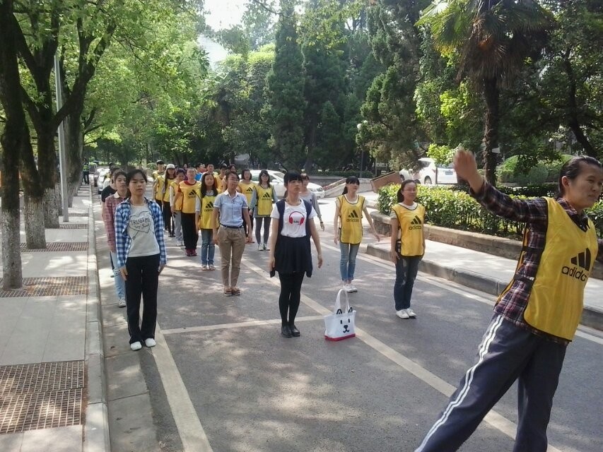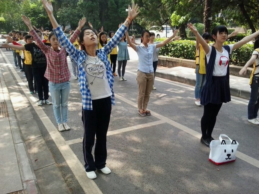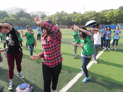 第一次树荫下全体集合,音乐响起。瞧!领操同学跳得起劲,大家在背