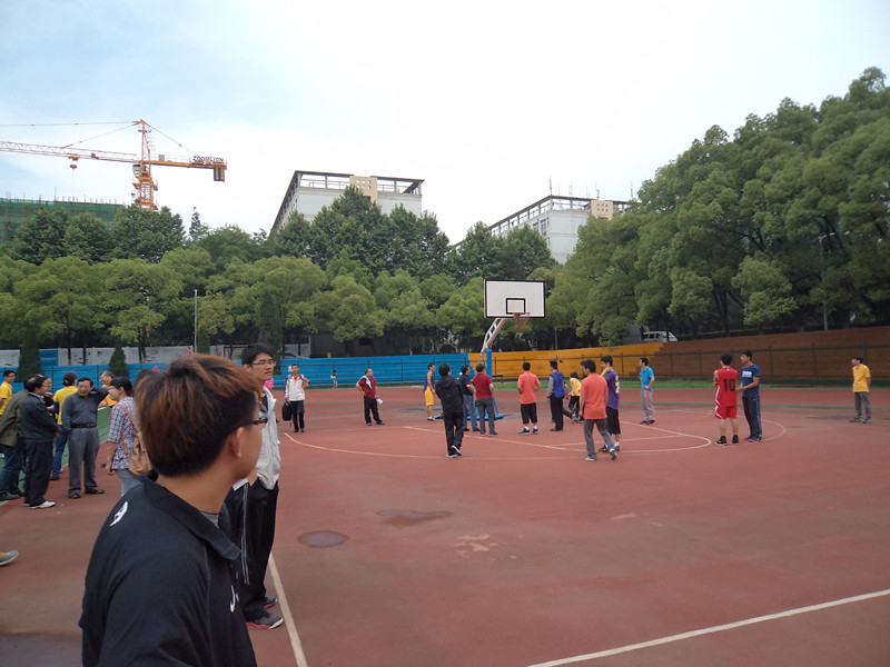 在烈日炎炎下,联络员在观看篮球赛,一场激烈的篮球赛即将爆发,相信这样这位联络员也喜欢打篮球,篮球场上有师生,这会是一次好看的比赛