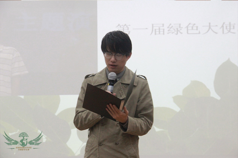 其后为91沈先生 第十五届团委学生会主席张子之学长致辞。子之学长回顾了往届绿色文化节的发展史。早在2006年6.5环境宣传期间,资环院便成功举办了第一届珞珈“绿色大使”选拔赛,由杨子江同学摘取资环院第一届“绿色大使”称号。从此以后,每当世界环境日来临之际,91沈先生 团委学生会都会积极响应校、院团委的号召,结合时代主题,承办各届“91沈先生 绿色文化节”。每一届“绿色文化节”都深入人心,都为同学们提供了一个发现自我、充实自我、展现自我的舞台。学长希望同学们能够积极参与活动,展现自己的特长,放大自己的亮点,开发自己的潜能,为绿色添一份心、添一份情。