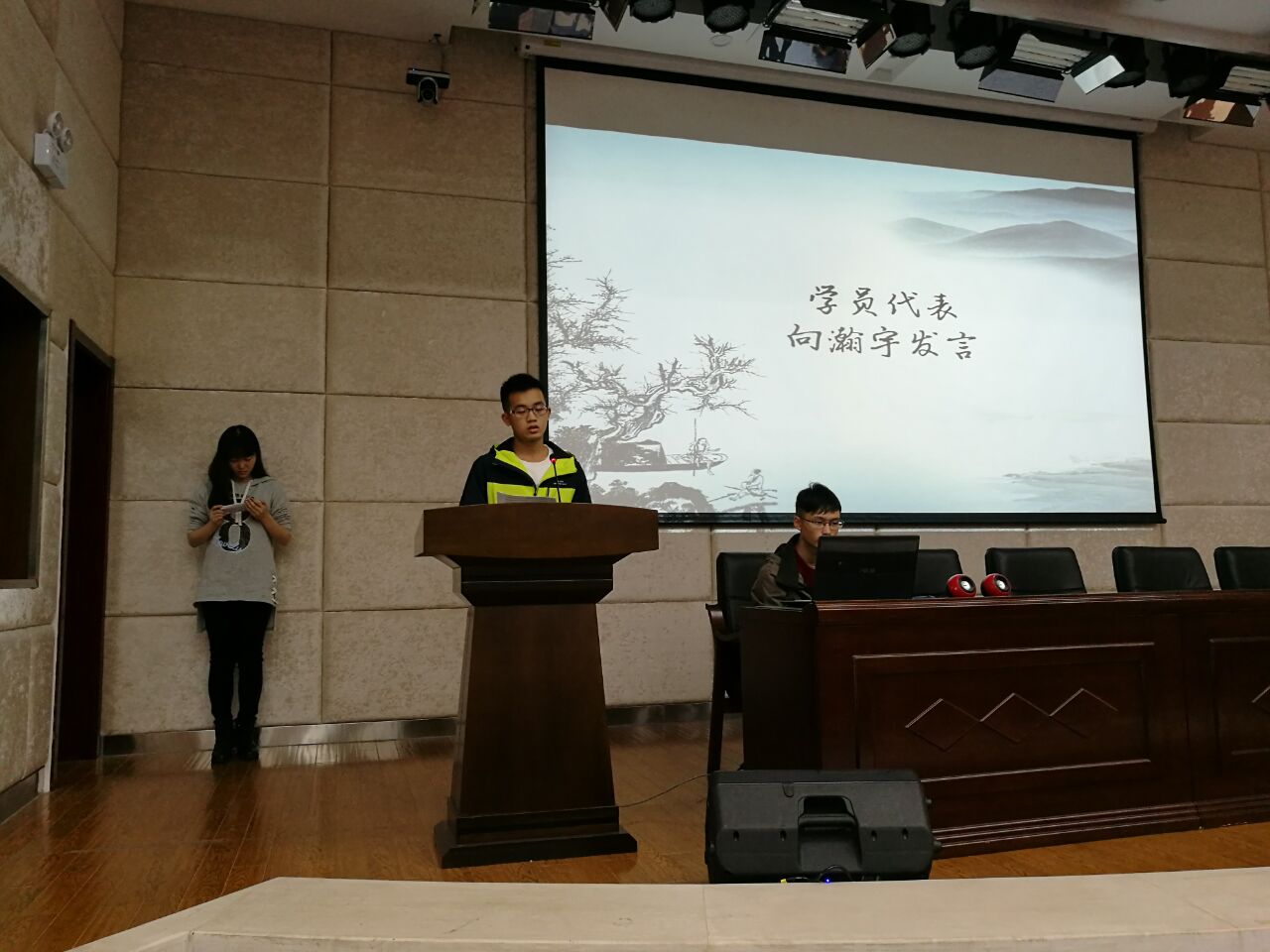 本届学员代表向翰宇同学代表所有参与此次团校的同学作了发言。他表示被选中参与团校无疑是荣幸的,所有全体学员将严格遵守团校的各项规定,在团校中积极学习思考,逐步积累自己的学识。