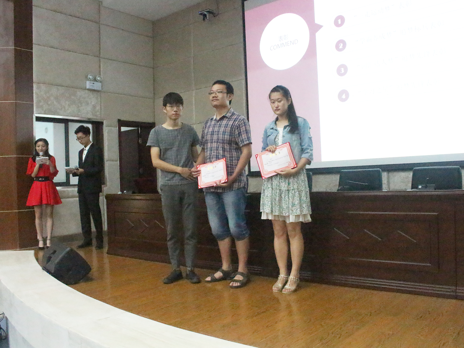 之后,又由院团委书记王曦阳老师为“学霸养成梦”词汇达人代表——2014级李泽堃、2015级杜颖同学颁发了荣誉证书并合影留念。“词汇达人”是为促进同学们的英语学习而设置的梦想项目,意在鼓励同学们注重日常积累,重视英语词汇的学习。