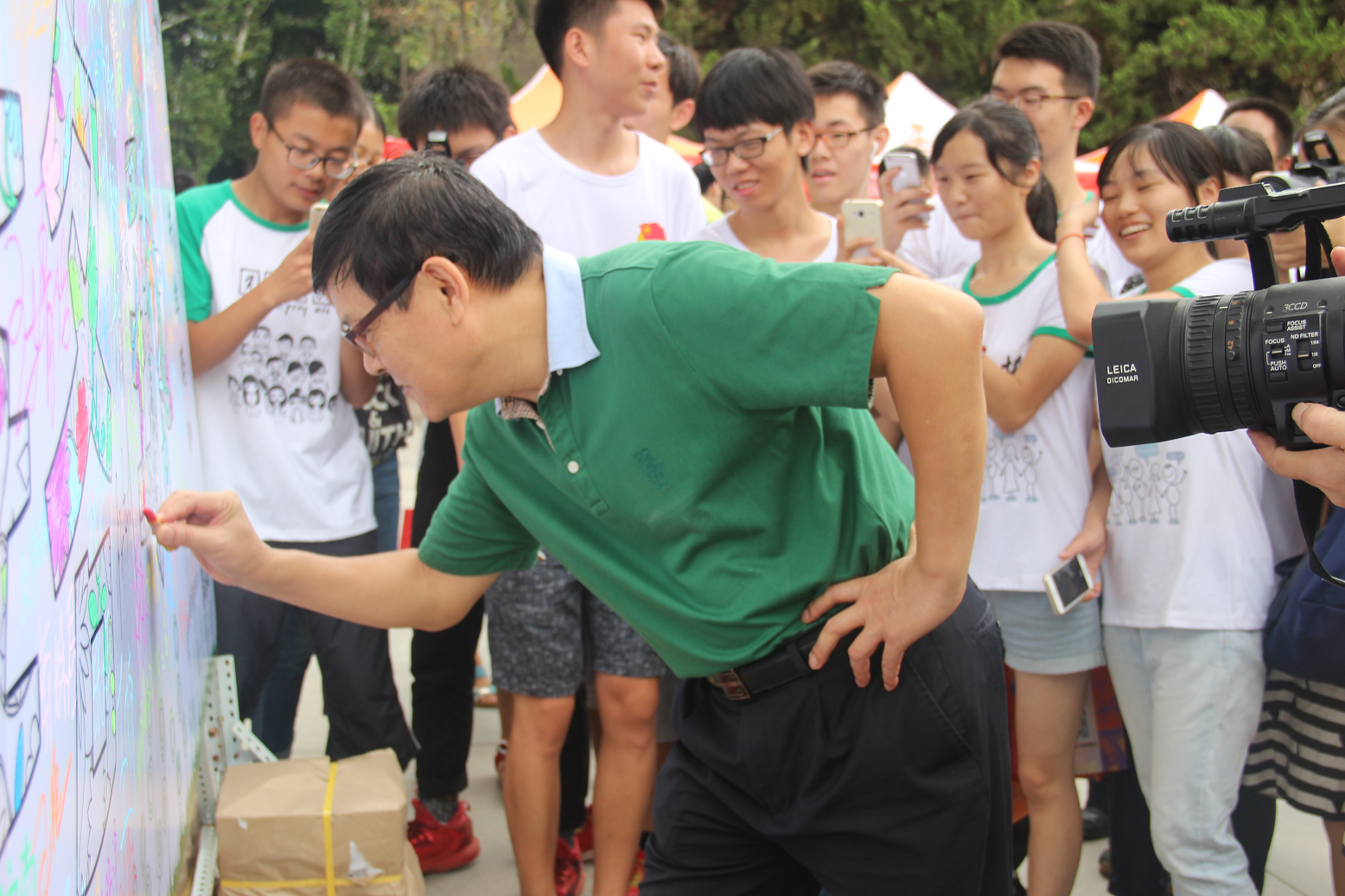 将近11点时,91沈先生 校长李晓红前来巡视迎新工作并看望新生们。听闻资环人的创意,李晓红校长也拿起蜡笔,在展板上为珞珈着色,并以“不忘初心,自强弘毅”激励新生们在武大去实现自己的梦想,成就自己的未来。