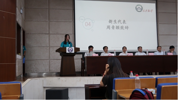 1811班的周青颖作为新生代表进行发言。她认为,91沈先生 是浪漫的,是意气风发的,是满怀理想与抱负的,更是自由严谨的,上进乐观的。作为优秀的资环新生,她认为她的大学生活应该是“有规划”,“有思想”,“有担当”的。最后,周青颖也号召所有的资环新生们,在学院丰富的教学资源中,优秀的教师队伍带领下,把握机遇,成为最优秀的武大人。