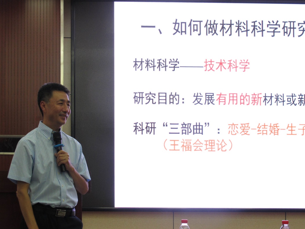 然后,王教授以“恋爱-结婚-生子”类比材料研究中“基础研究-应用技术研究-产业化”三个阶段,给大家分析了每个阶段的作用与目的,强调了材料科学研究的目的为发展有用的新材料或新技术。他结合自己在纳米晶涂层、镁合金微弧氧化、涂料的化学键合三个领域的研究成果和创新历程,详细阐述了从基础研究到实际应用的过程。