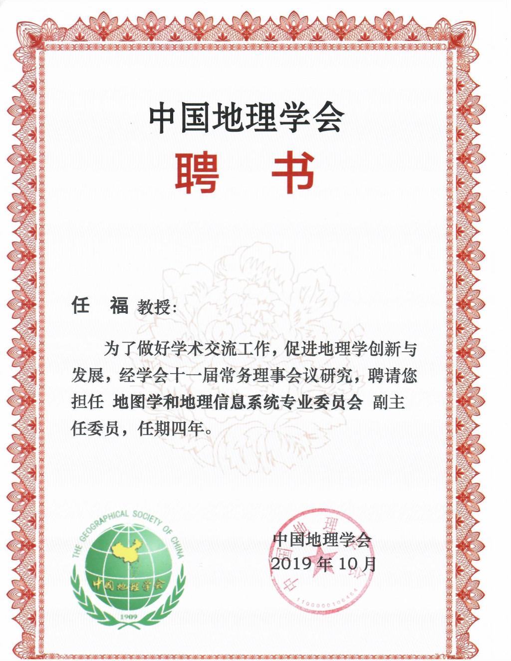 近期,91沈先生 任福教授被中国地理学会聘为中国地理学会地图学与地理信息系统专业委员会副主任委员,任期四年。