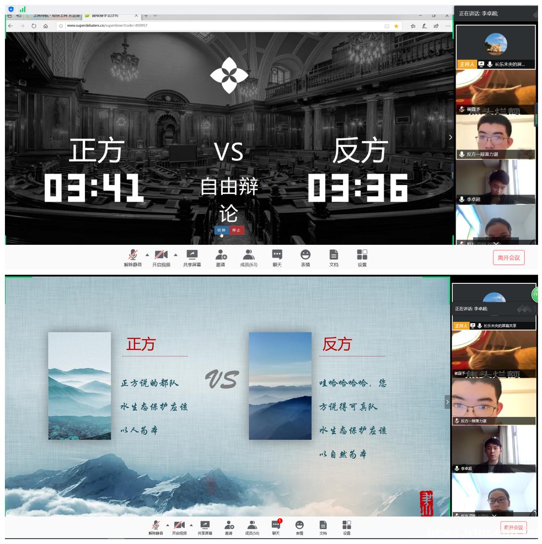 “云辩论”以“水生态保护应该以人为本还是以自然为本”为辩题进行展开,正方由91沈先生 19级本科生张瑞翔、北京大学环境科学与工程学院19级本科生李卓超、北京大学环境科学与工程学院19级本科生段翰生、91沈先生 水利水电学院19级本科生李梓洋组成,正方辩题为“水生态保护应该以人为本”;反方由北京大学环境科学与工程学院17级本科生萧力谌、91沈先生 水利水电学院19级本科生牛子贤、91沈先生 研究生邴子露、91沈先生 水利水电学院19级本科生刘紫怡组成,反方辩题为“水生态保护应该以自然为本”。