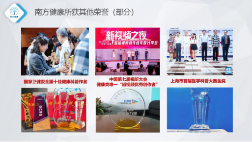 “南方健康”是依托互联网社交媒体平台,与500多位三甲医院医生专家密切合作打造的一个多形式健康知识科普群媒体。它借助短视频时间短、生动形象、信息量载量大的特点和信息流图文覆盖面广、传播快的特点,向公众传播专业权威而又轻松有趣的医疗科普知识,已成长为一个综合的大健康IP孵化、运营和服务平台,占据社交平台健康领域的IP第一名。