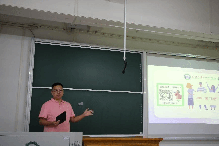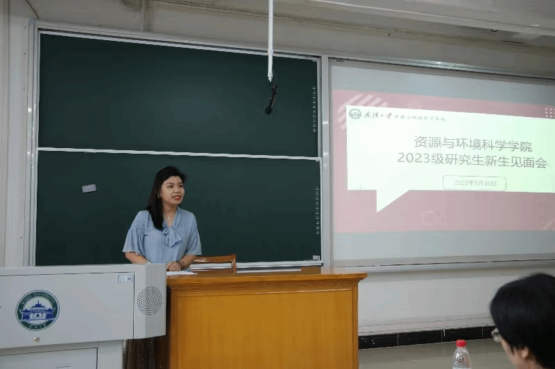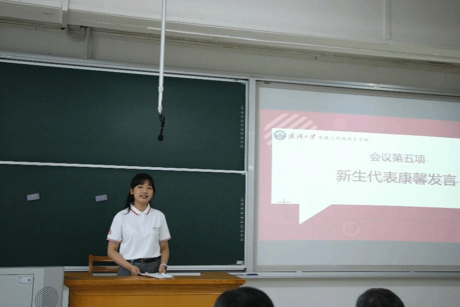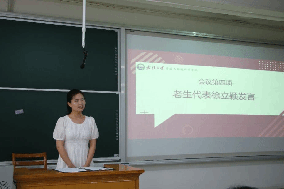 第四项,老生代表徐立颖博士发言。徐立颖同学分享了自己在武大的求学经历。认为武大资环学院卧虎藏龙,是一个培养人才的很好的平台。她表示,逃避并不是解决问题的手段,面对科研道路上的难题,我们要勇往直前,不能畏惧退缩,努力寻找解决问题的方法。资环学院是一个温暖的大家庭,科研道路可能很漫长,但绝不会孤独。作为全省“研究生样板党支部”的支书,徐立颖博士也谈到了她所组织和参与的一些党建等活动,并号召新生在全国最美的校园中提升自己,在理论和实践中锻炼自己。
