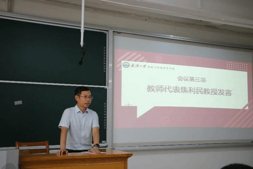 第三项议程,地理科学与国土资源系主任焦利民教授作为教师代表发言。焦利民教授提出研究生应该创造知识、解决问题。基于此,对新生提出了几点期许。一是科研选题面向国家需求。资源环境领域,一直是可持续发展重大问题,具有非常重要的地位,同学们应该与导师密切沟通,确定自己的研究方向;二是开拓创新,勇于探索无人区。当科研过程中找不到相关文献时,要勇于向前一步,结果与预想不对并不是一件坏事,或是新方向的诞生,要培养自己独立从事科研的能力;三是只争朝夕,不负韶华,不负时代。要养成自律的心态,不要提前进入退休生活,现在的努力对以后的发展起到的是加速度的作用。最后,焦老师祝同学们身体健康、工作愉快、学业有成。
