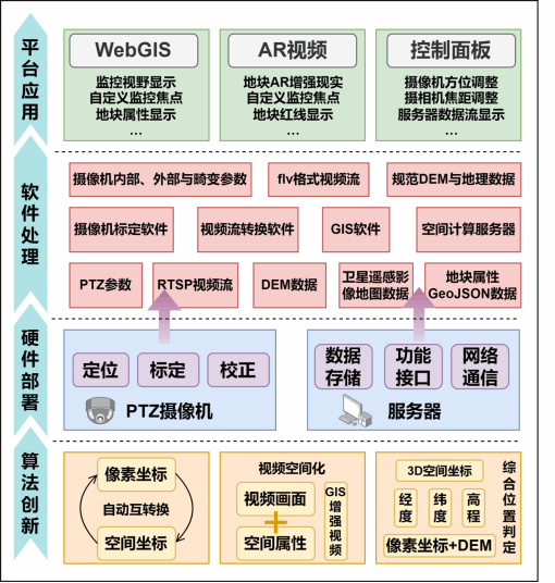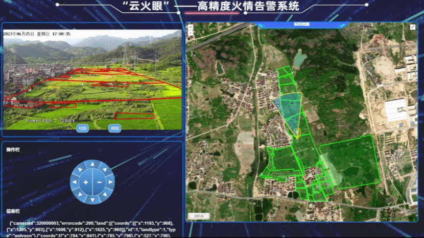 团队基于商用通用PTZ摄像机,综合运用地理信息(GIS)、遥感(RS)和计算机视觉(CV)等技术,创新地提出了一种PTZ摄像机视频帧坐标与地理坐标之间的实时互转换方法(“视频空间坐标重建”),并开发了一套PTZ摄像机实时视频显示与控制和互联网地理信息系统(WebGIS)相结合的软件系统。本系统很好地解决了AI识别的火情告警信息视频帧(像素)坐标和Web地图空间坐标之间的双向实时转换和同步显示问题,为使用者提供了告警信息更直观、准确的3D实景和2D地图定位服务。