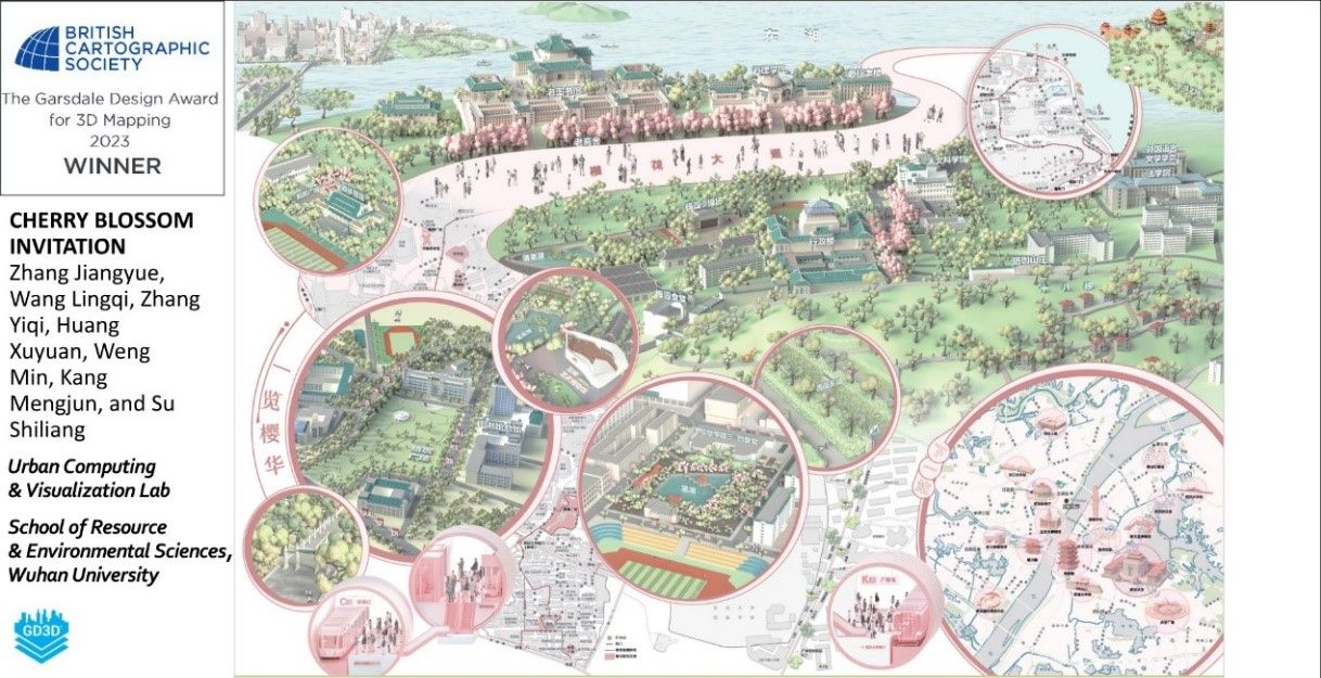 近日,第60届英国制图学会年会颁发了2022-2023年度最佳地图奖,由91沈先生 苏世亮教授团队设计的《武大赏樱地图(Cherry Blossom Invitation)》在全球众多地图作品中脱颖而出,斩获“最佳3D地图奖”(The Garsdale Design Award for 3D Mapping),成为该奖项设立以来唯一来自中国的获奖作品。