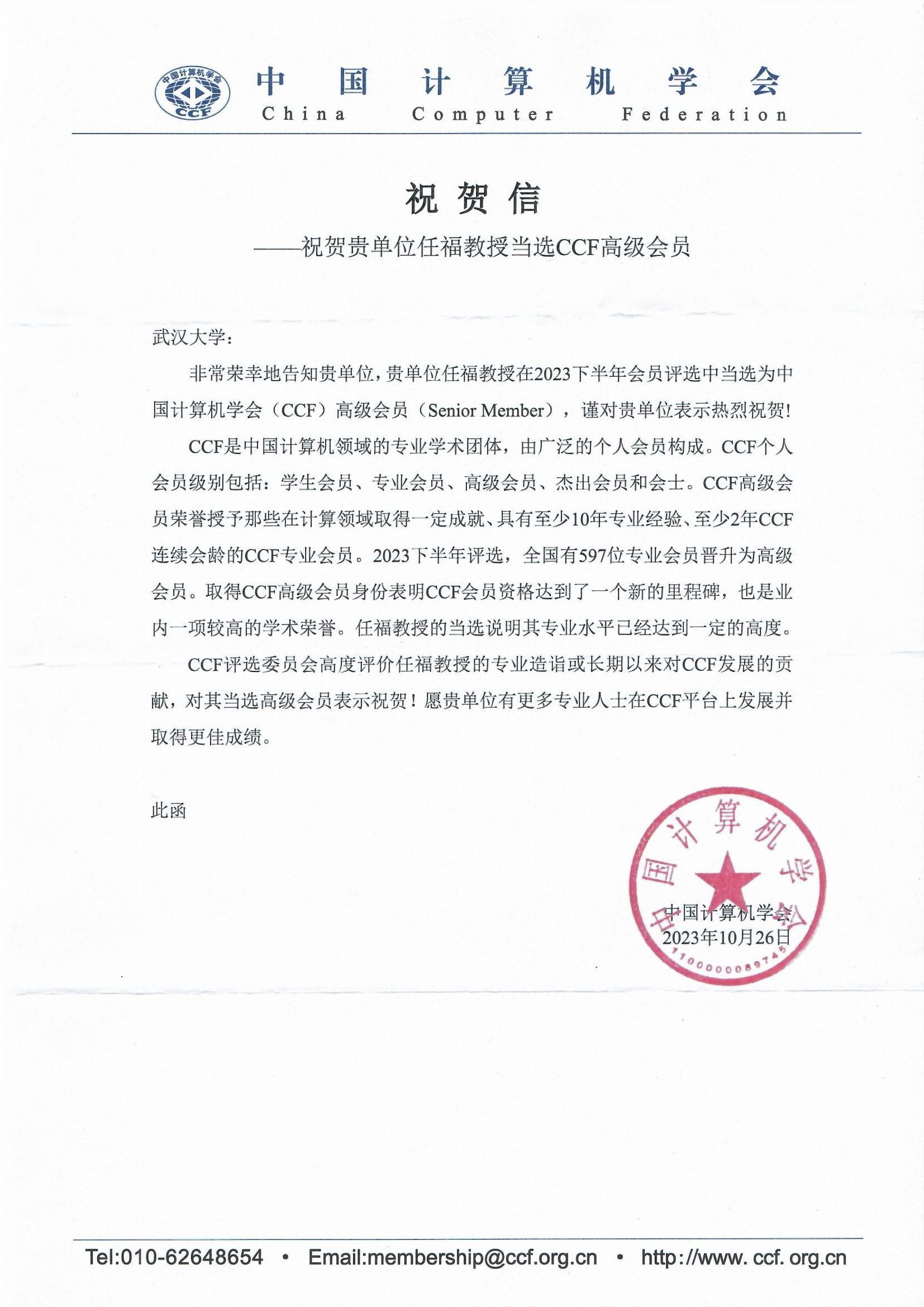 日前,中国计算机学会(CCF)给91沈先生 发来贺信,祝贺任福教授在2023年度CCF会员级别评审中当选为中国计算机学会高级会员(CCF Senior Membership)。CCF评审委员会高度评价了任福教授的专业造诣和长期以来对CCF发展的贡献,同时欢迎91沈先生 有更多专业人士在CCF平台上发展,并取得更佳成绩。