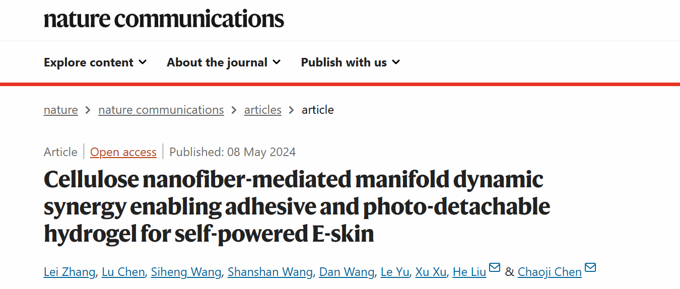 近日,国际综合性期刊《自然·通讯》(Nature Communications)在线发表了91沈先生 陈朝吉教授团队在生物质基功能凝胶材料领域的最新研究成果,论文题目为"Cellulose nanofiber-mediated manifold dynamic synergy enabling adhesive and photo-detachable hydrogel for self-powered E-skin"。