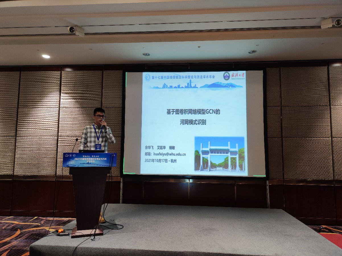 余华飞参会的论文题为“基于图卷积网络模型GCN的河网模式识别”,研究主题为深度学习与地理信息模式识别的结合,通过GCN卷积学习模型对流域河网的不同形态模式给出了识别方法,解决了不确定性河网结构的认知与智能计算问题,体现了数据驱动与地学领域知识驱动相结合的地理空间深度学习思想。会上不仅展示该学习模型的计算过程,还通过大量实际数据展示了认知识别结果,高质量的模拟人的识别效果给与会代表留下深刻印象。