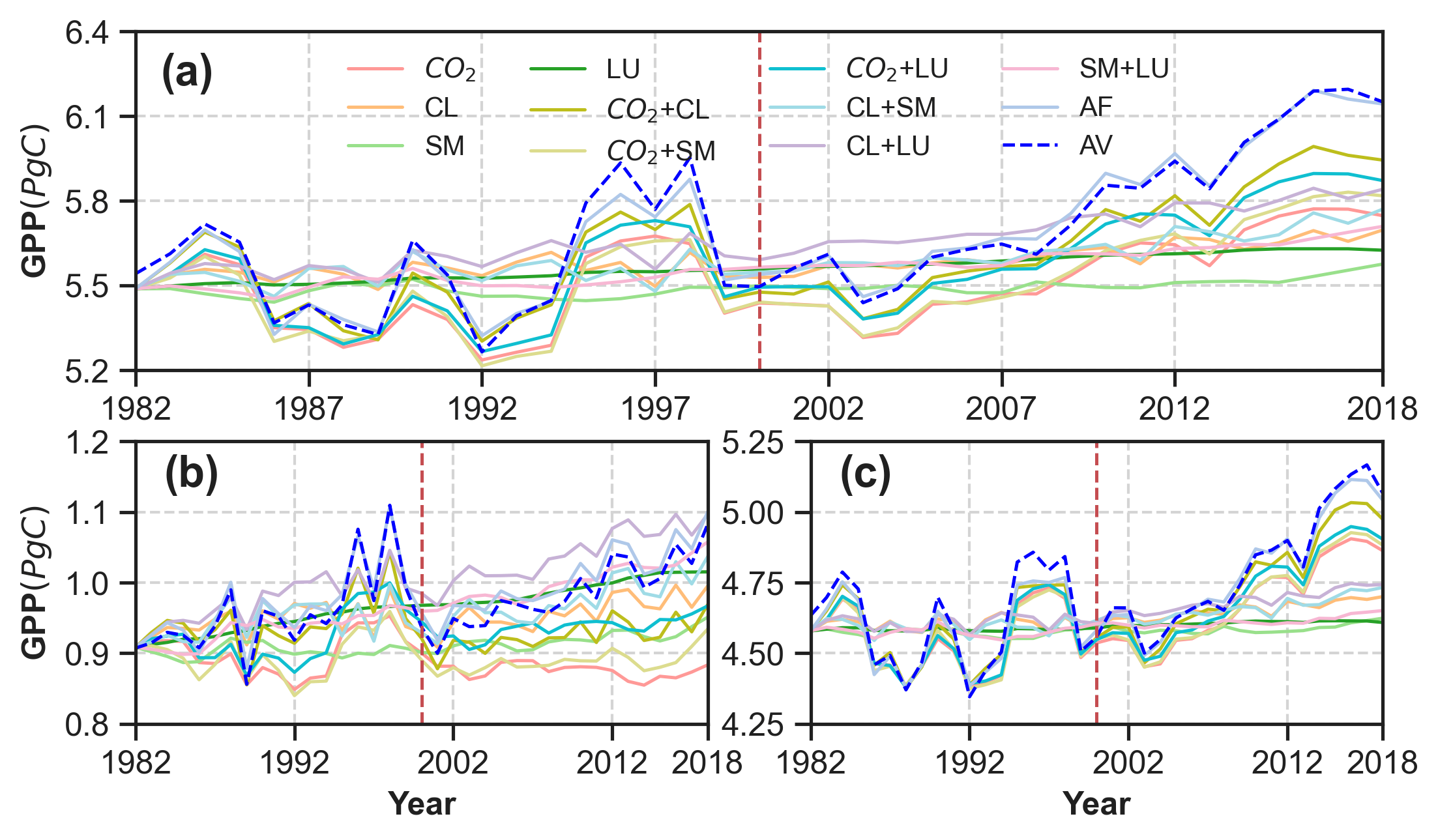 针对这一问题,本研究基于多源数据集探讨了植被总初级生产力对CO2浓度、气候变化和人为土地利用变化等多种因子的复杂响应。研究发现,在近四十年里,中国植被总初级生产力显著增强(图1)。然而,植被生产力对环境变化的响应已经从单因子主导(CO2施肥效应)时期向多个交互因子共同决定时期转变(图2),史无前例的工业化、城市化以及人为土地利用变化等对生态系统的共同影响导致了这种转变。该研究明确了这种转变在中国的区域分异及其关键制约因素。基于自然的解决方案被认为是缓解气候变化最为成熟的途径之一,该发现强调了在基于自然的解决方案中考虑综合视角和区域差异的必要性,对中国2060年碳中和目标实现具有重要意义。该研究近期以“Saturation response of enhanced vegetation productivity attributes to intricate interactions”为题发表于全球变化和生态学的国际顶级期刊Global Change Biology (IF: 13.211)。
