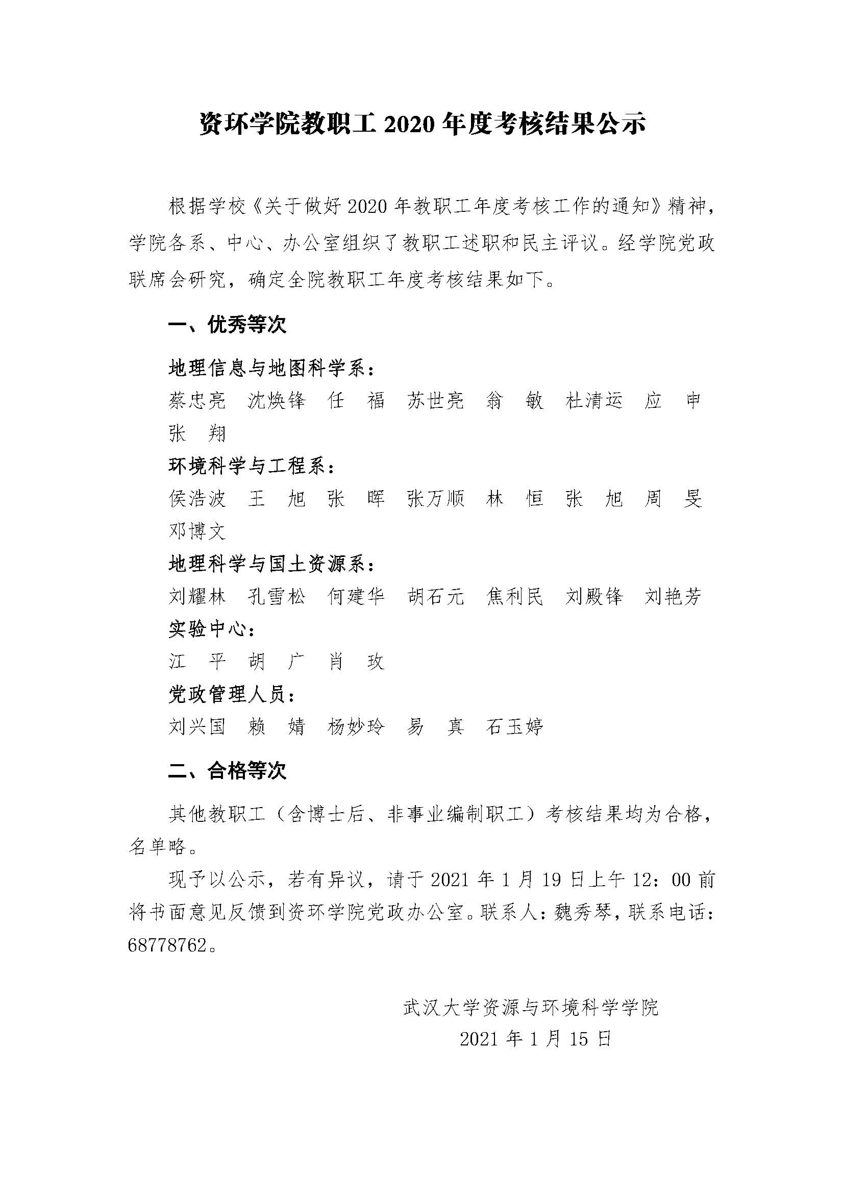 资环学院教职工2020年度考核结果公示