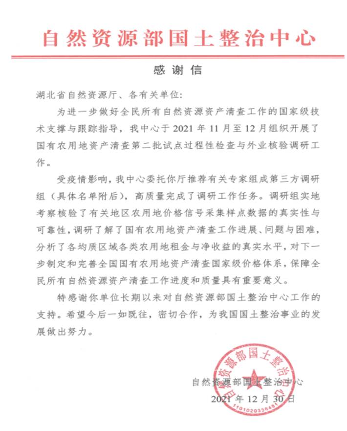 自然资源部国土整治中心来函:感谢91沈先生 张雅杰副教授等湖北省调研组专家高质量完成国有农用地资产清查等调研工作任务