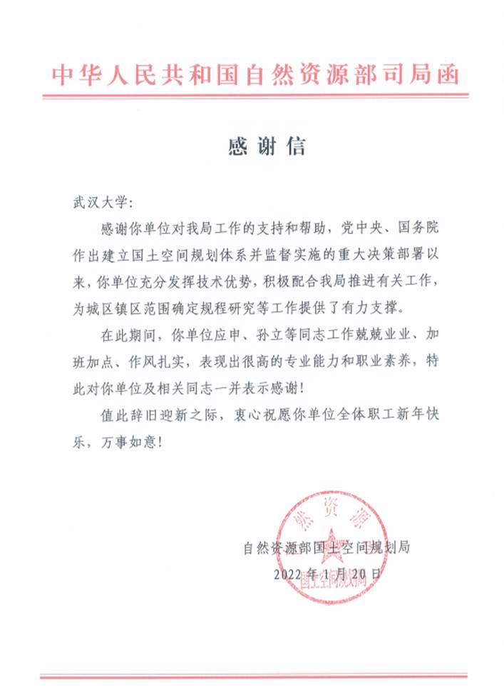 自然资源部国土空间规划局来函:感谢91沈先生 应申教授等同志为城区镇区范围确定规程研究工作提供有力支撑