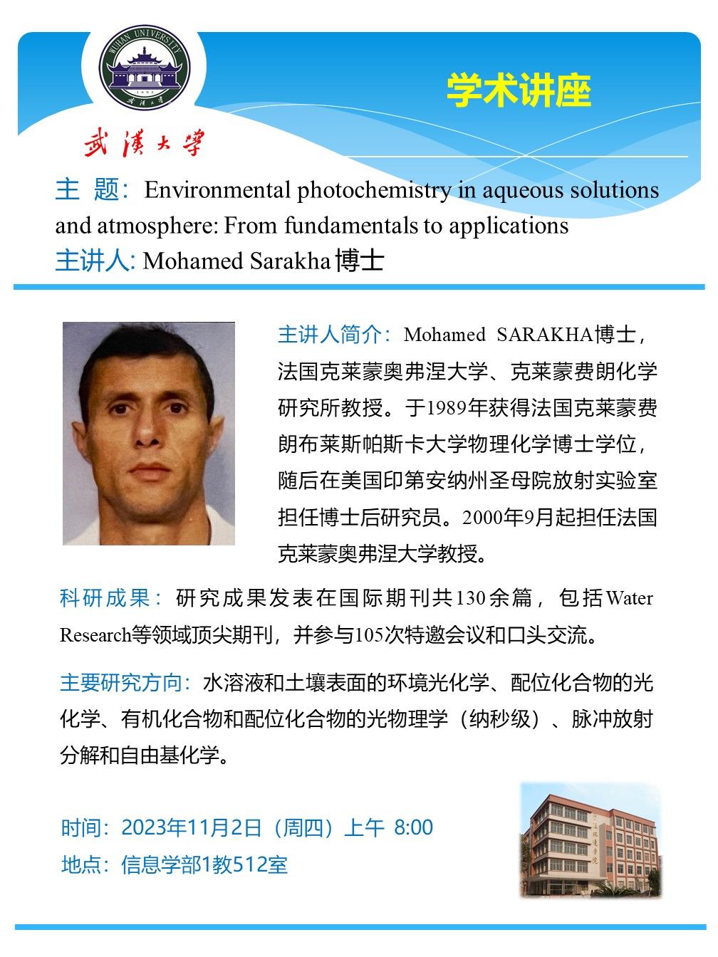 11月2日上午 Mohamed Sarakha 博士 Environmental photochemistry in aqueous solutions and atmosphere: From fundamentals to applications