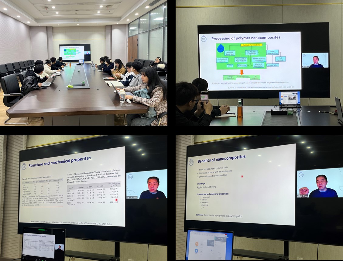 讲座期间,周琪老师用通俗易懂的语言和丰富的图片和视频向同学们展示了纳米纤维素的奥妙和魅力,引起了同学们的浓厚兴趣和热烈讨论。通过这次讲座,研究生们不仅了解了纳米纤维素这一新兴领域的基本概念和最新动态,也拓宽了自己的视野和思路,为今后的科研工作提供了启发和帮助。讲座结束后,周琪老师还与学院师生进行了热烈的交流和讨论,分享了他在纳米纤维素研究方面的经验和心得。
