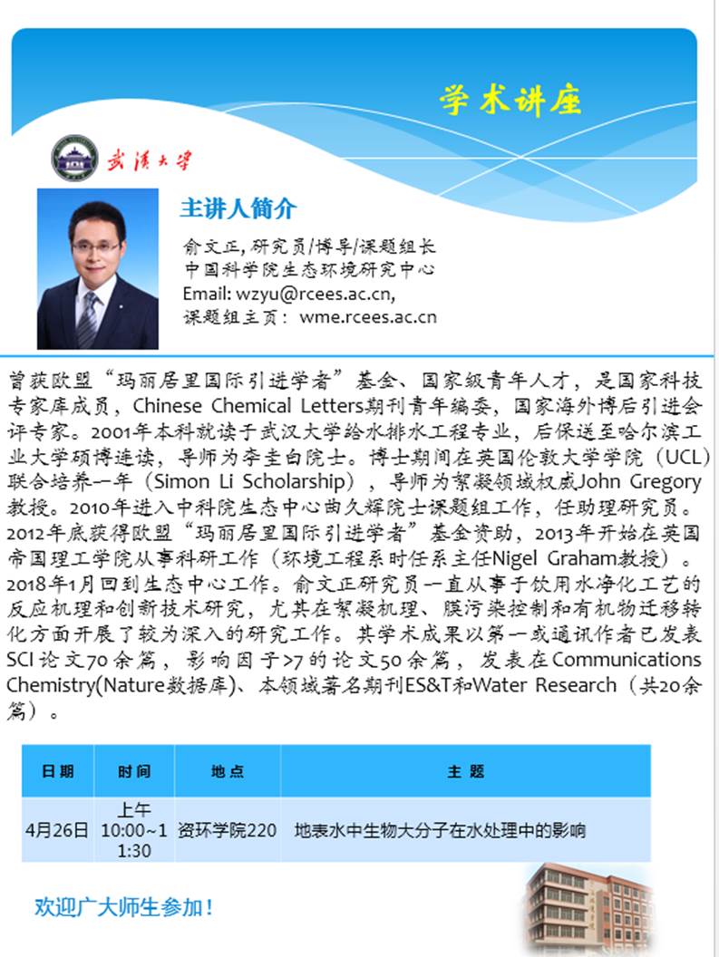 4月26日上午10:00俞文正研究员:地表水中生物大分子在水处理中的影响