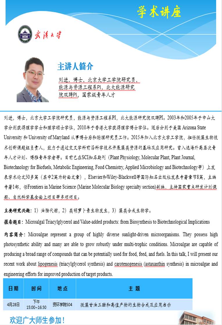 4月28日下午 刘进 研究员:微藻甘油三酯和高值产物的生物合成及应用启示