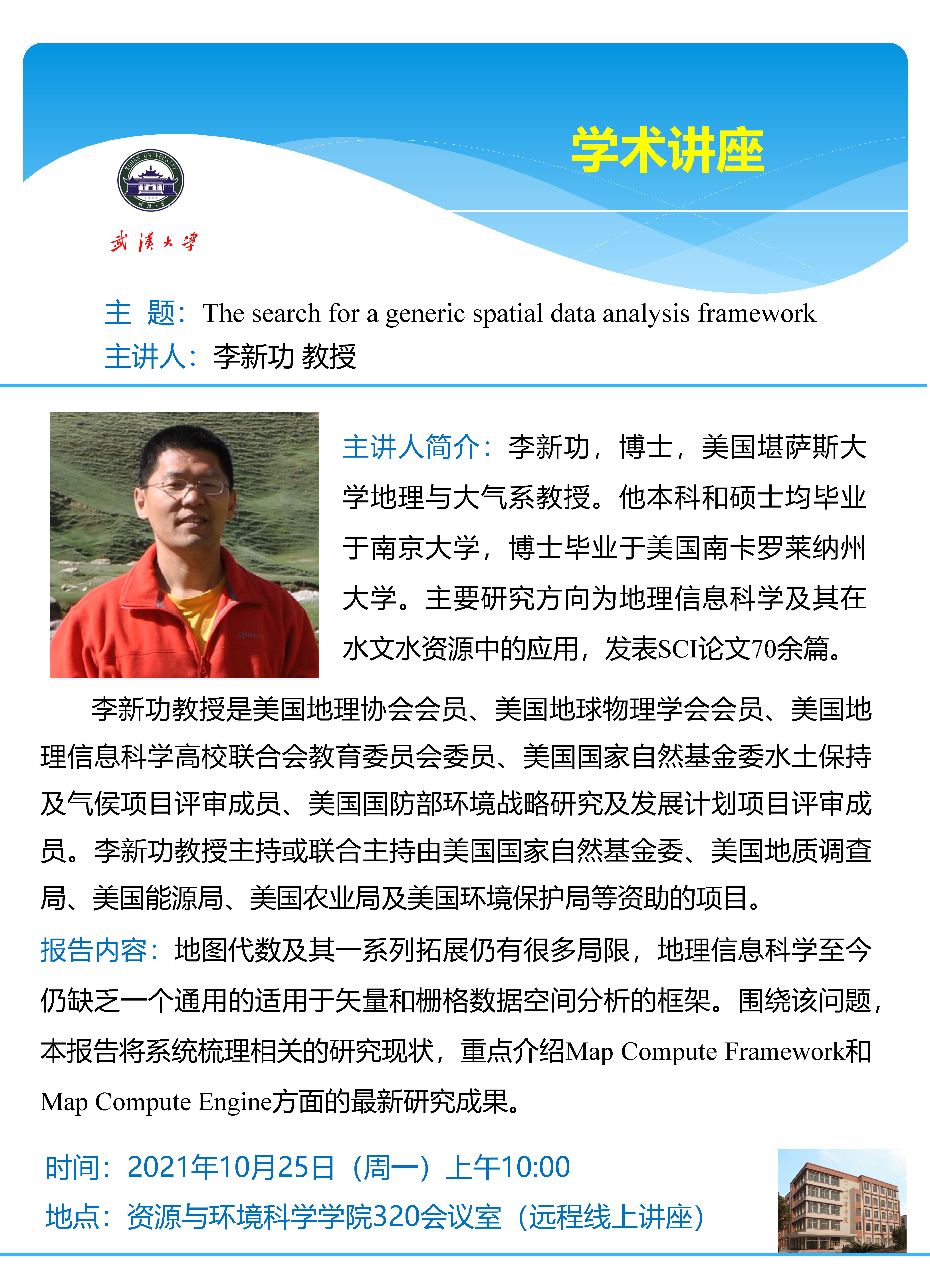 10月25日上午美国堪萨斯大学李新功教授:The search for a generic spatial data analysis framework