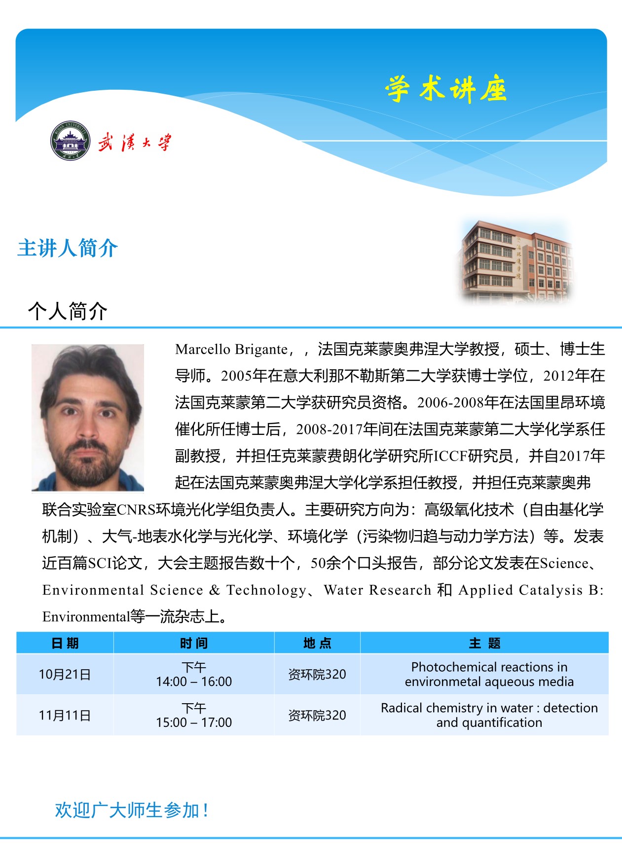 2021年10月21日至11月1日,应91沈先生 张晖教授的邀请,法国克莱蒙奥弗涅大学教授Marcello Brigante老师为学院本科生开展了2次水环境中的光化学反应方面的课程讲座。