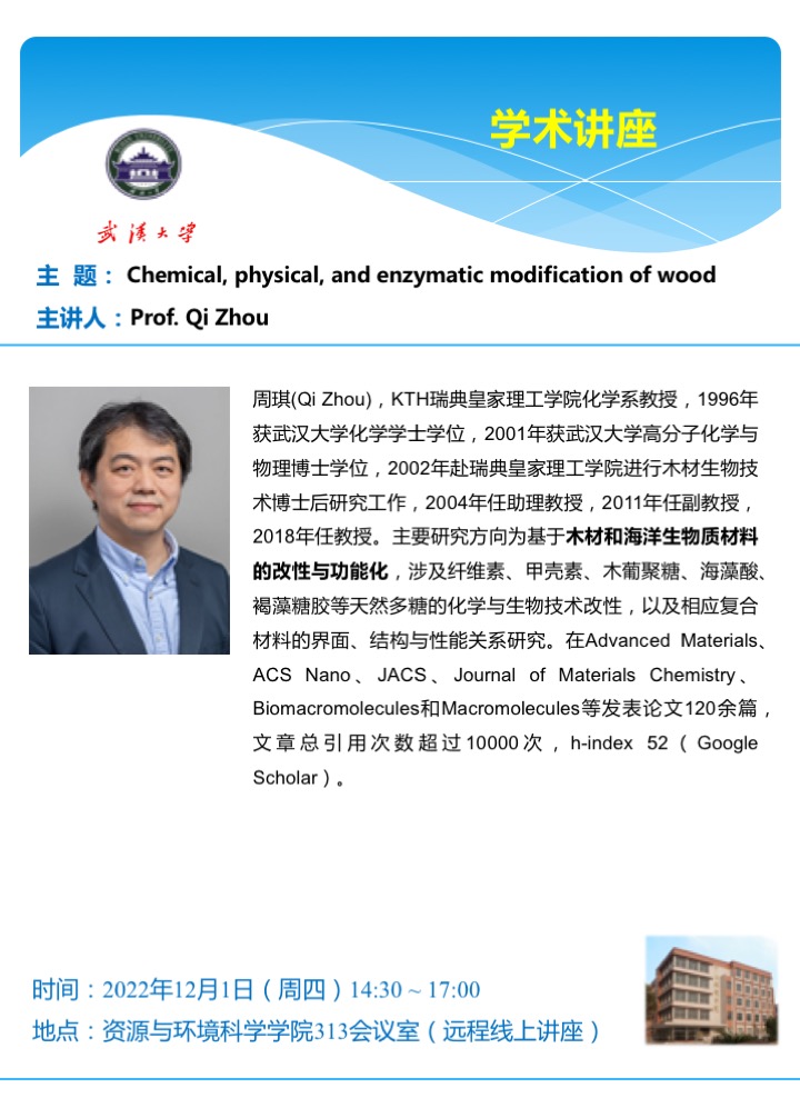 【学术讲座】 Chemical, physical, and enzymatic modification of wood