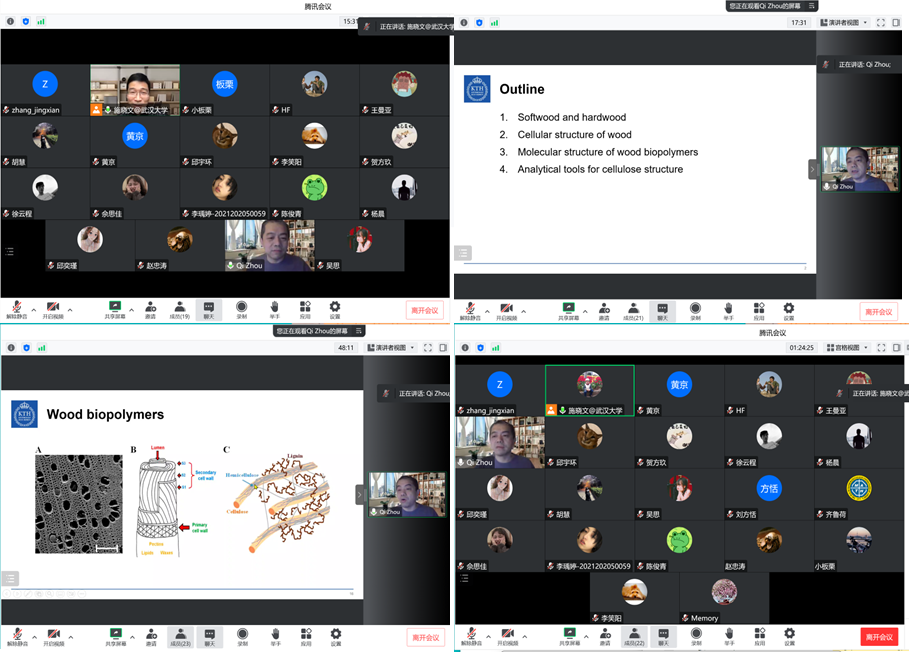 11月29日下午,周琪教授进行了题为“Wood structure and wood biopolymers”的讲座,在上一次讲座中,同学们对木头纳米技术的应用有了一定了解,周教授继续详细地介绍了木头的层级结构、硬木软与木的区别、木材的分子结构、纤维素的结晶形态、木头生物聚合物。周教授的讲座充满魅力、富有激情,同学们进一步了解到了木头这一常见生物质材料的奥秘,受益匪浅。会后,周老师与同学们探讨了一些实验细节问题,对于材料学来说,实验的操作细节往往决定了实验的成败。