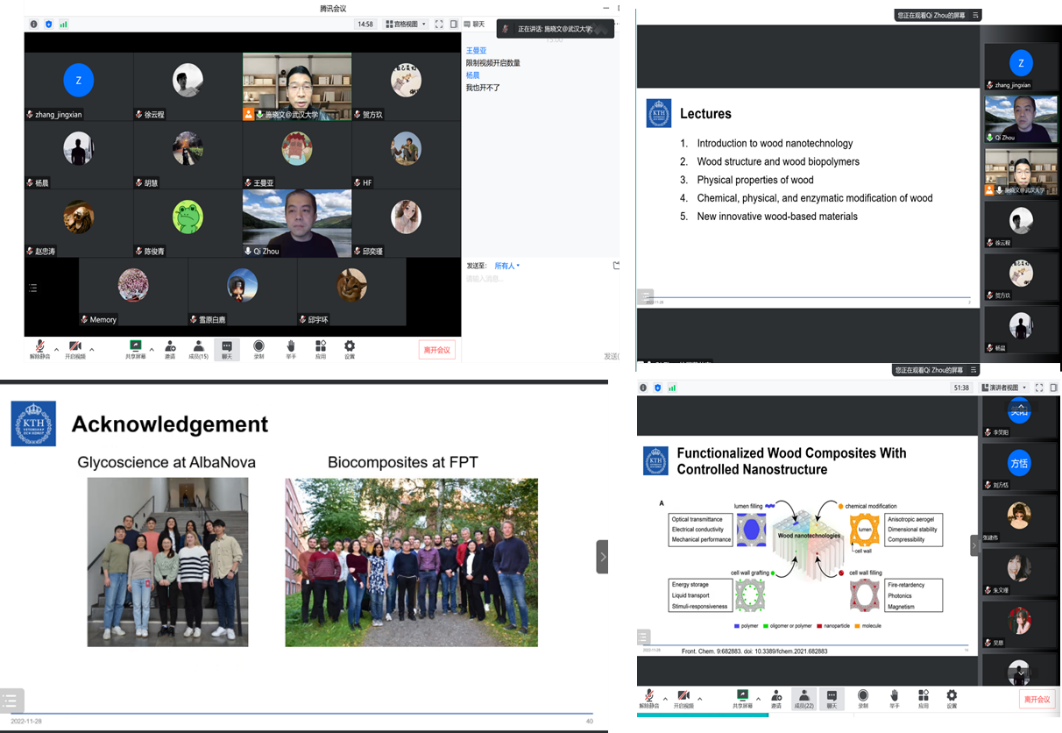 2022年10月11日至22日,应91沈先生 施晓文教授的邀请,瑞典皇家理工学院周琪老师为学院研究生开展了5次木头纳米技术系列讲座。