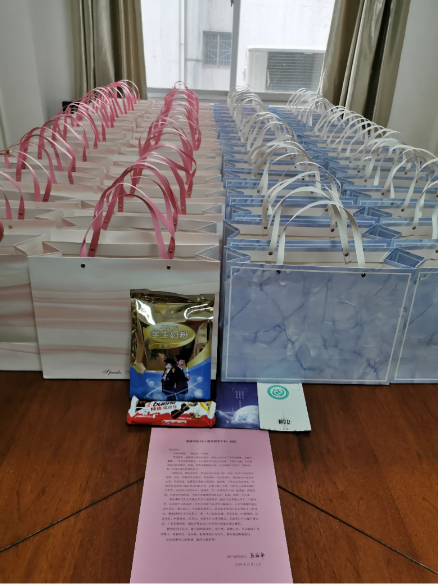 2020年12月15日,为了给本院的考研学子加油鼓劲,91沈先生 为本科2017级108位考研学子送上了考研“加油包”。在学院领导的大力支持下,2017级辅导员马丽华老师带领毕业生委员会的同学选购物资、搬运礼品、分装礼袋,为所有考研的同学精心准备好一份份“加油包”,由各班负责人将“加油包”分发到同学们手中。