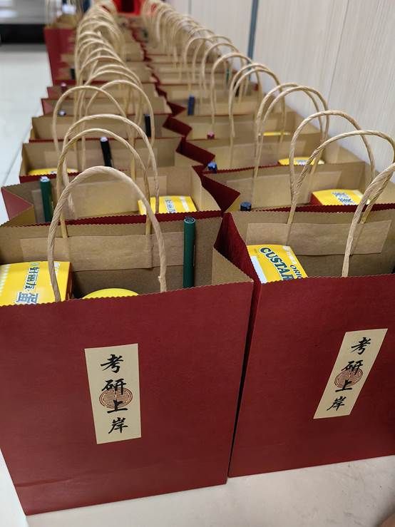 本次学院准备的大礼包包含祈福文具、牛奶和零食等,每一份礼物都包含着老师们对考研学子们的亲切关怀和美好祝福。老师们一边为同学们送上满怀祝福的大礼包,一边询问了同学们的备考情况,嘱咐大家在最后时期调整好心态,保证身体健康,以饱满的状态迎接此次考试。