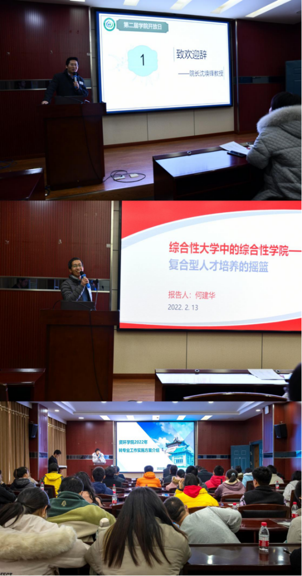 17个学院,还有来自武汉市重点中学的高中生。副院长何建华教授以“综合性大学中的综合性学院——复合人才培养的摇篮”为题,对学院专业特色以及人才培养模式进行了详细解读。党委副书记冯丹老师对学院转专业相关政策进行宣讲,并对学院出国交流项目进行了介绍。与会师生还观看了学院招生宣传片和环境专业创新科研视频。开幕式结束后,同学们在工作人员的带领下分八个点进行了参观学习。